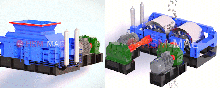 對輥破碎機是利用兩組單獨傳動的輥軸,相對旋轉產生的擠軋和磨剪力來破碎物料。物料經給料口落入兩輥之間,經對輥擠壓破碎之后成品自然落下,當遇到過硬或者不可破碎的物料時,輥子可憑液壓缸或彈簧的作用自動退讓,使雙輥之間的間隙增大,過硬或不可破碎的物料自然落下,以此來保證機器不被損壞,相向轉動的兩個輥子可以調節液壓缸或彈簧的壓力來控制產品的出料粒度。